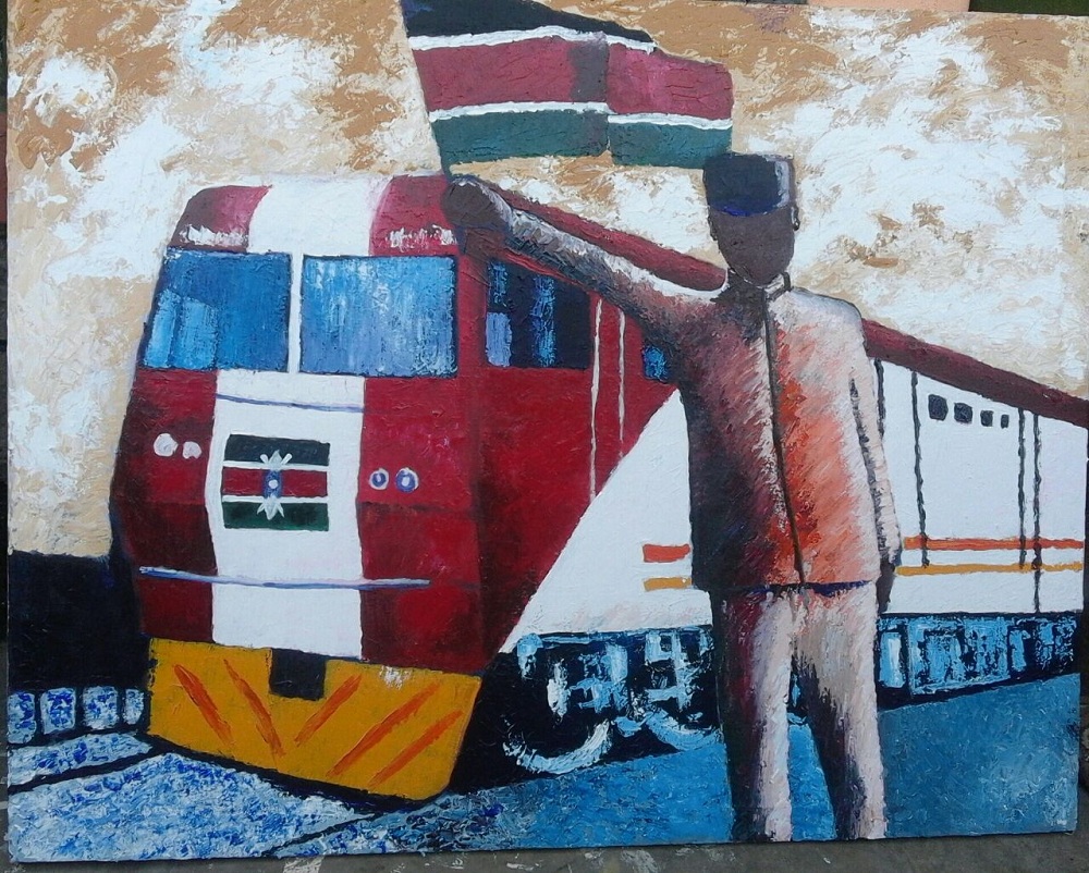 作者帕特里克·阿多尤(Patrick Adoyo)是肯尼亚国家博物馆展览部主任,肯知名画家,曾应邀赴中国创作和展出作品,其风格以现代主义见长,并融入鲜明的肯尼亚民族特色。当欣闻蒙内铁路不久将开通,阿多尤挥笔创造此幅画作,表达肯尼亚人民喜迎铁路的心情。
